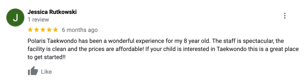 See what other parents have to say about Polaris Taekwondo! We are always looking for ways to improve the learning experience students have and we take all feedback into account. Some of the staff favorites are below, but we encourage you to go look at all of them for yourself (click here!)